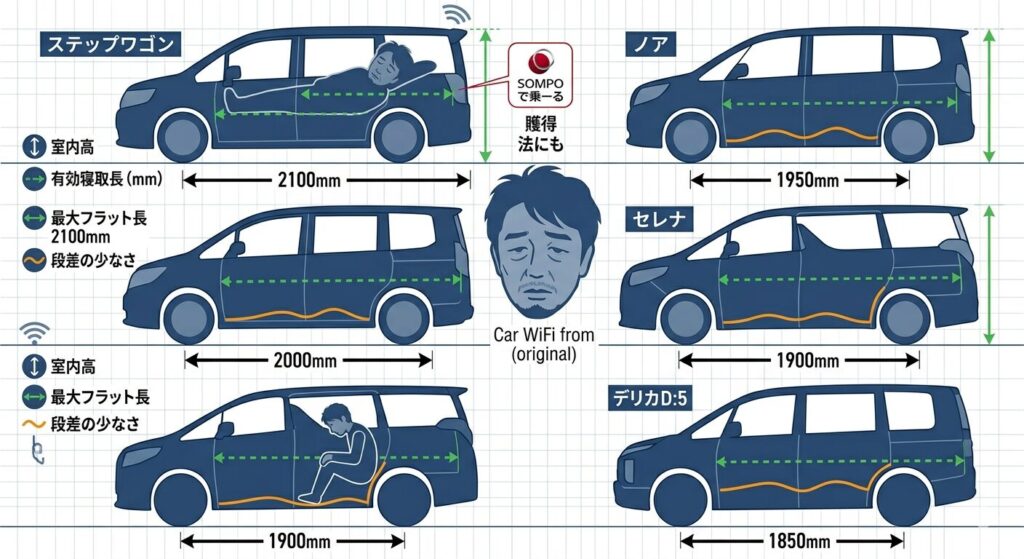 【徹底比較】主要ミニバン5選の「車中泊スペック」一覧表