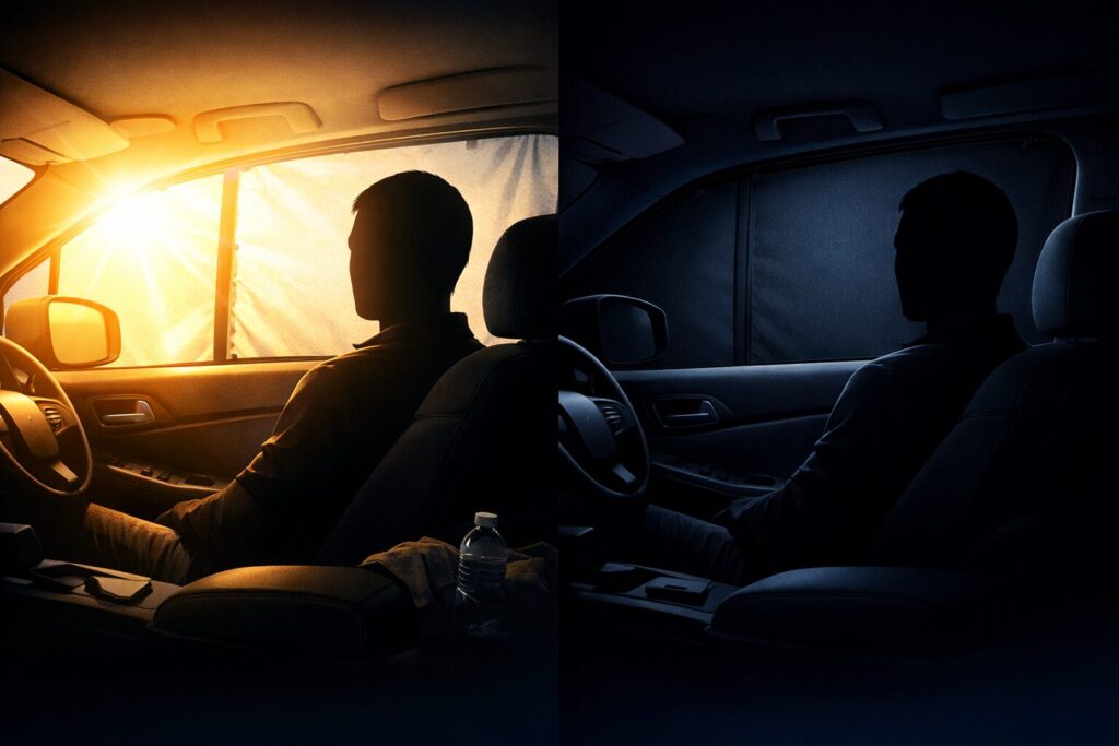 - NG:薄いサンシェードで直射日光が入る → 車内が蒸し暑い